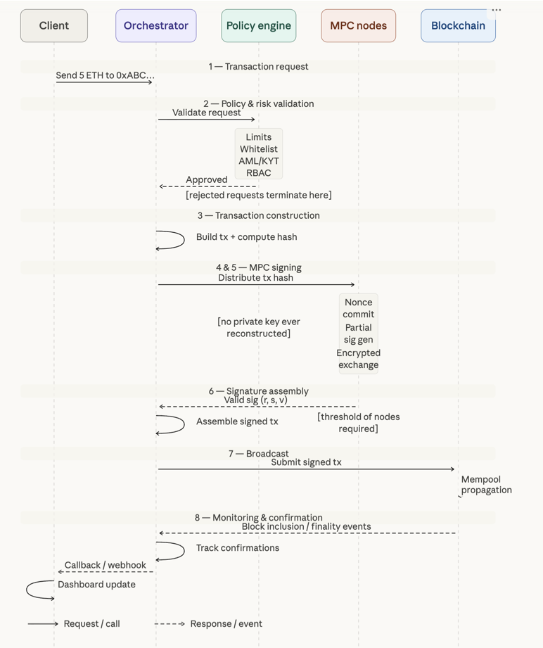 Instead of generating a traditional private key, the system creates multiple cryptographic key shares distributed across independent signing nodes. These shares collaborate through a secure MPC protocol to generate valid blockchain signatures without reconstructing the private key at any point.
